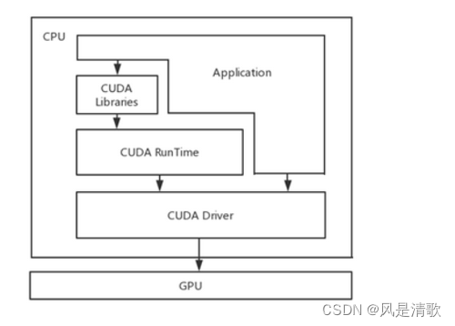 CUDA是NVIDIA公司发布的一种操作GPU计算的硬件和软件架构,下图是CUDA的软件架构,开发应用程序以主机(CPU)为出发点,应用程序可以调用CUDA运行时API、CUDA驱动API以及一些已有的CUDA库。所有这些调用都将利用设备(GPU)的硬件资源。
