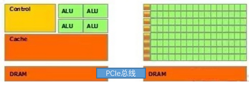 GPU是graphics procession unit 的缩写,意味图形处理器,与之对应的一个概念是CPU,即center procession unit(中央处理器),一块典型的CPU拥有少数几个快速的计算核心,而一个典型的GPU拥有几百到几千个不那么快速的计算核心,如下图,黄色是控制器,绿色是算数逻辑单元,橙色是存储器,CPU和GPU之间通过PCIe总线连接通信。