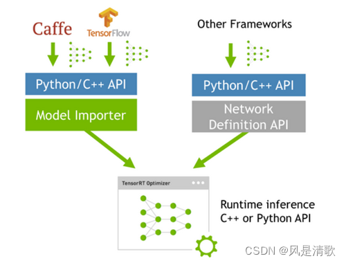 tensorRT是基于python、C++、CUDA编写的一个库,其核心代码为C++和CUDA,用于优化经过训练的的深度学习模型以实现高性能推理。具体流程是将训练好的网络直接扔到tensorRT中,不再依赖深度学习框架(caffe、TensorFlow、pytorch等),如下图所示: