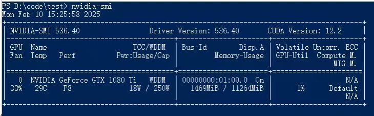 4、安装完成后可以在cmd或PowerShell界面上输入nvidia-smi验证,当出现如下界面的时候说明CUDA安装成功,上面显示了你的显卡型号,利用率等一些信息